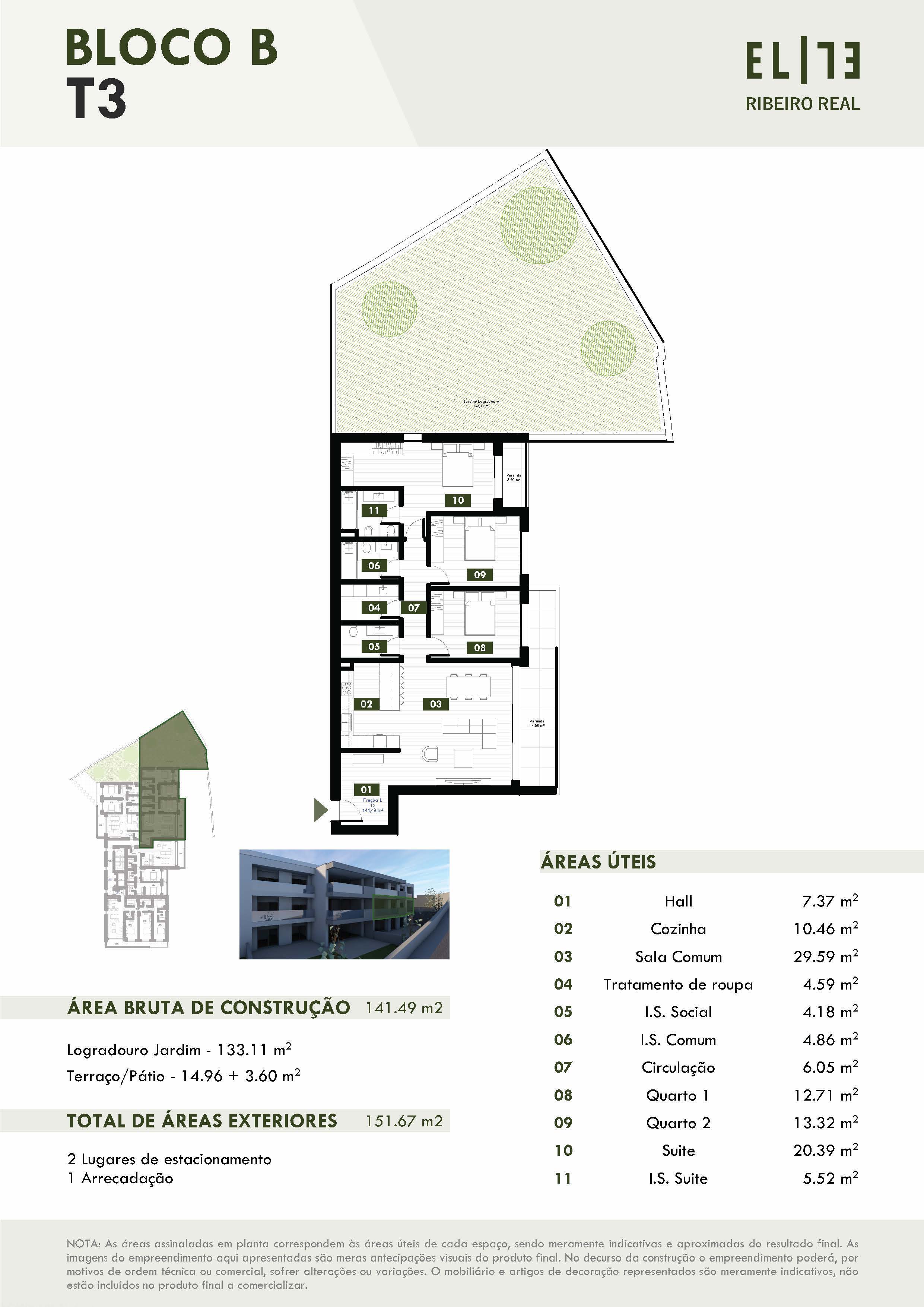 Este T3 é composto por uma sala de estar e jantar em open space com a cozinha, está equipada, com acesso a varanda exterior. O espaço noite é composto por dois quartos simples com roupeiros embutidos e casas de banho comum ao quartos, um dele com aceso a varanda. O terceiro quarto é em suite, com casa de banho privada, closet e varanda privada. O apartamento dispõem de lavandaria, uma casa de banho social, uma arrecadação e 2 lugares de estacionamento. Este dispõem ainda de um jardim/Logradouro com 133m2.