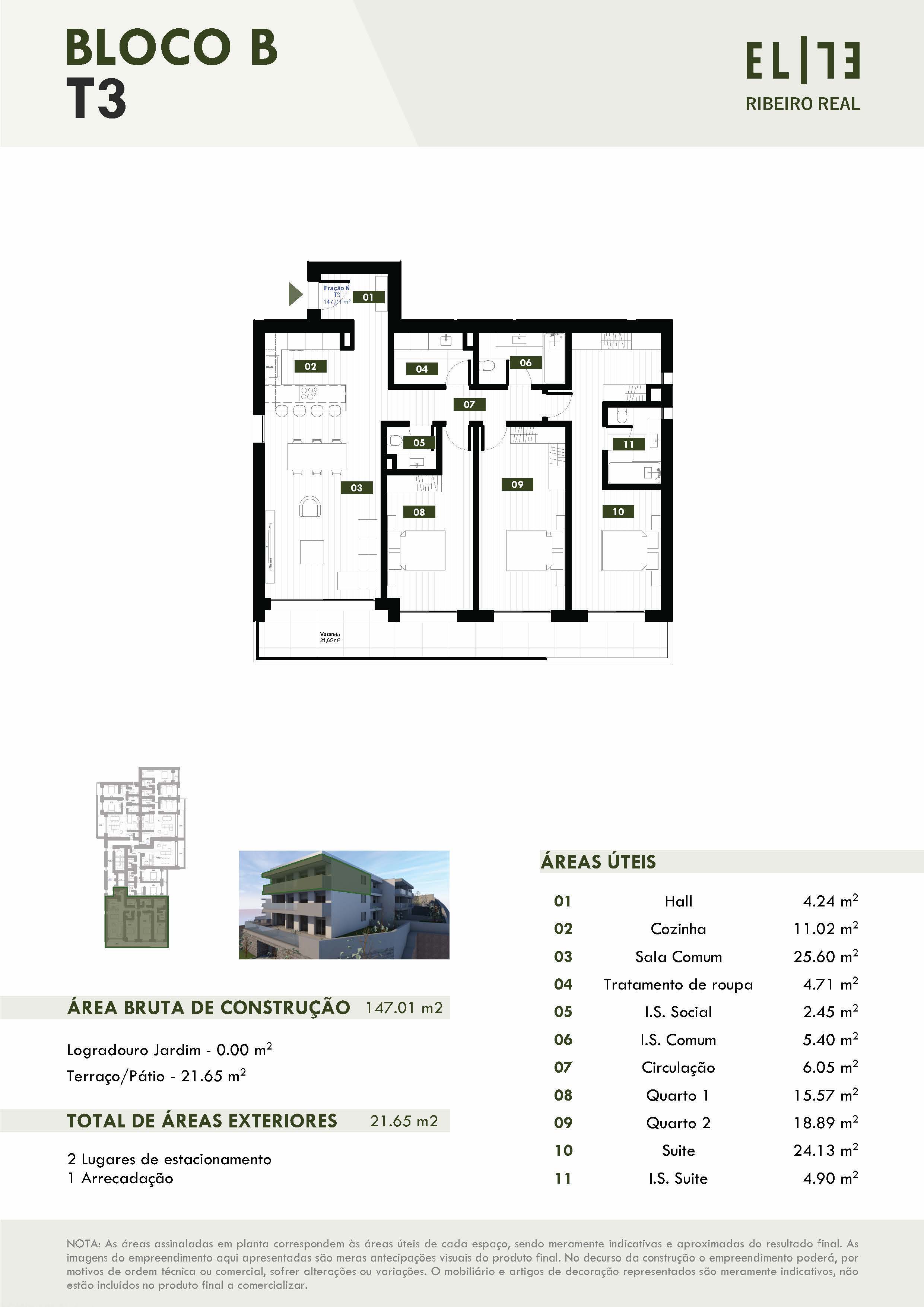 Este T3 é composto por uma sala de estar e jantar em open space com a cozinha, está equipada, com acesso a varanda exterior. O espaço noite é composto por dois quartos simples com roupeiros embutidos e casas de banho comum ao quartos. O terceiro quarto é em suite, com casa de banho privada e closet. Todos os quartos tem aceso a varanda. O apartamento dispõem de lavandaria, uma casa de banho social, uma arrecadação e 2 lugares de estacionamento.