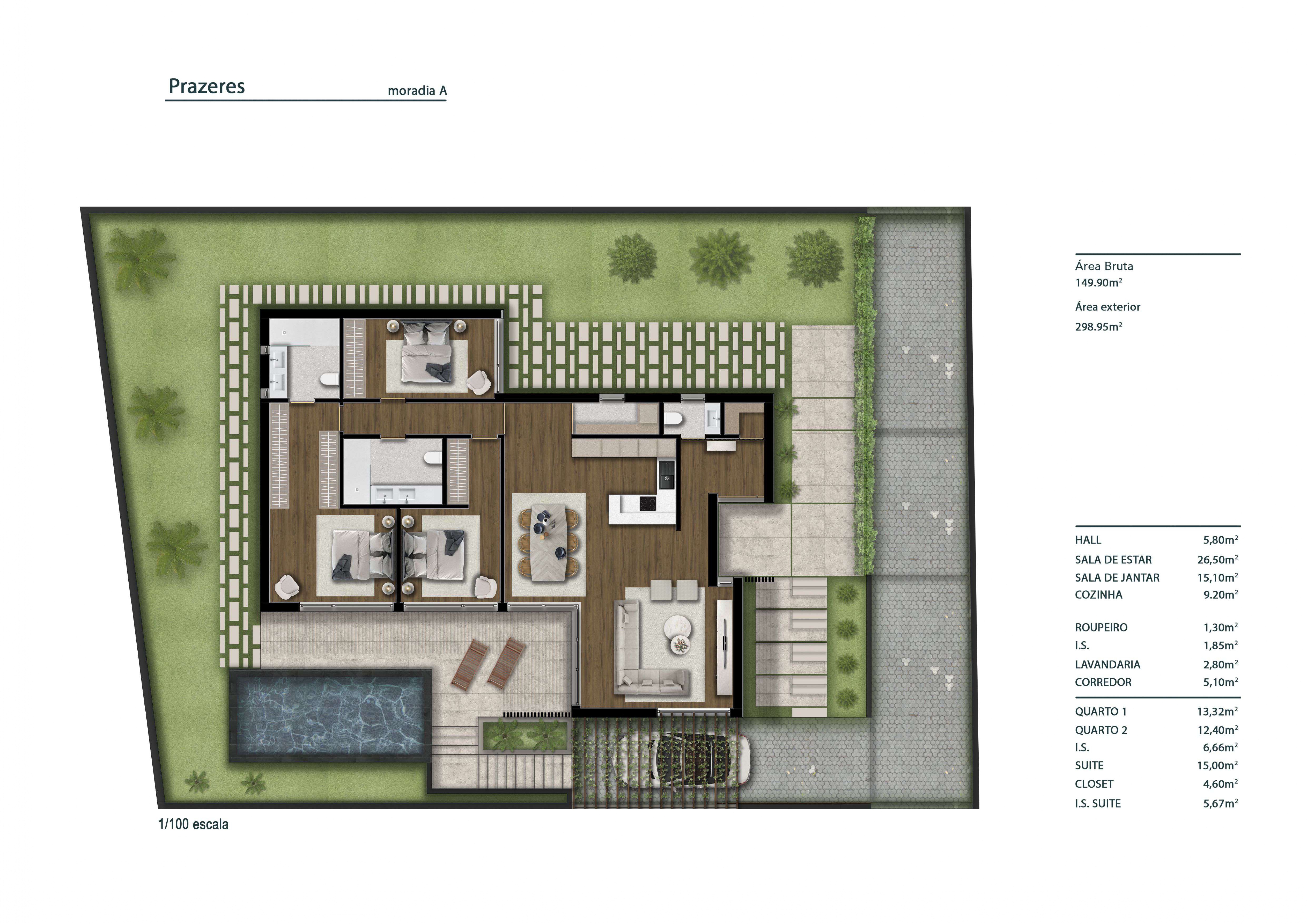 El exterior ha sido cuidadosamente diseñado para el ocio y el bienestar, con zonas de jardín y una piscina, ideal para disfrutar durante todo el año.